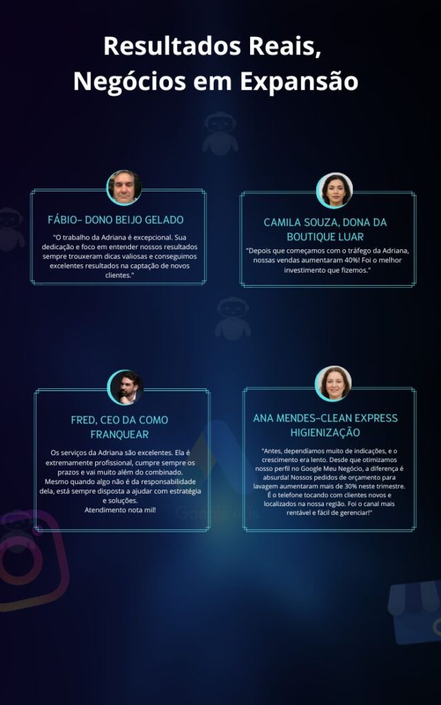 Embora os resultados possam variar de acordo com o tipo de negócio e a estratégia aplicada, normalmente começamos a ver um aumento significativo em visibilidade e engajamento nas primeiras semanas. As vendas podem começar a escalar gradualmente após a otimização das campanhas.
